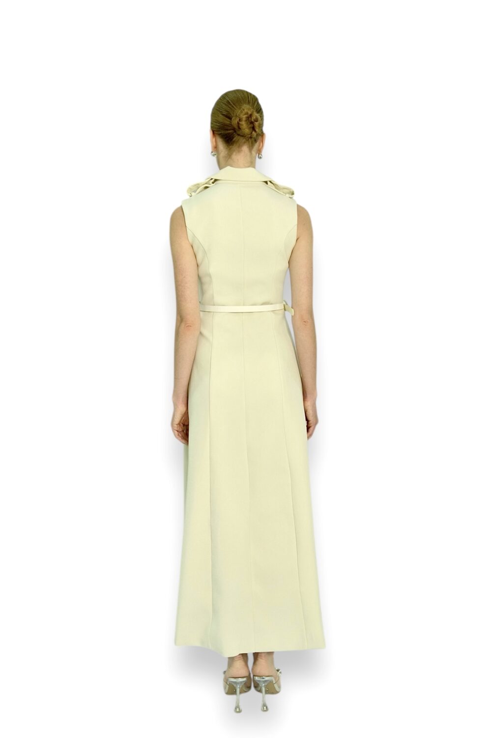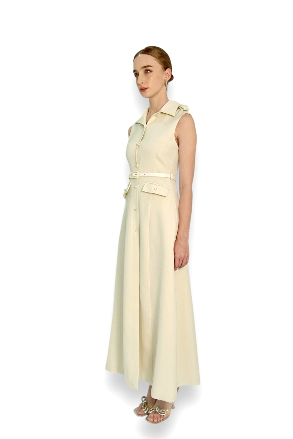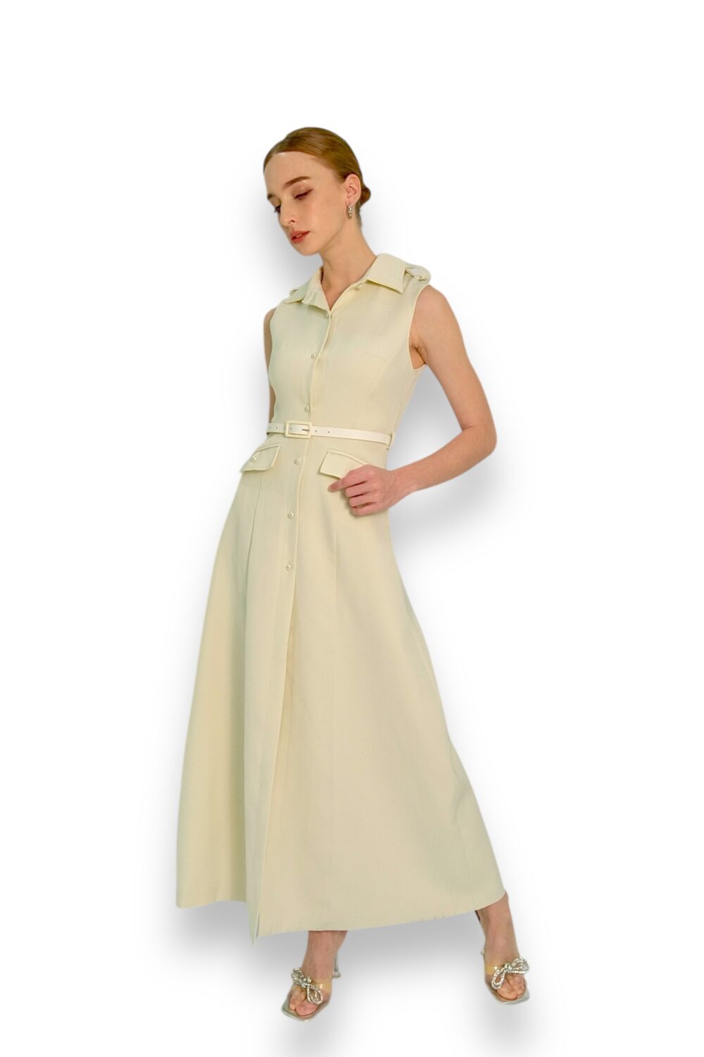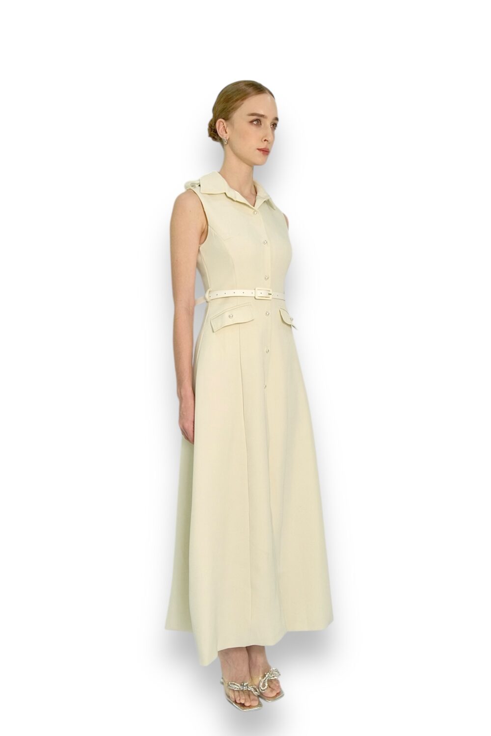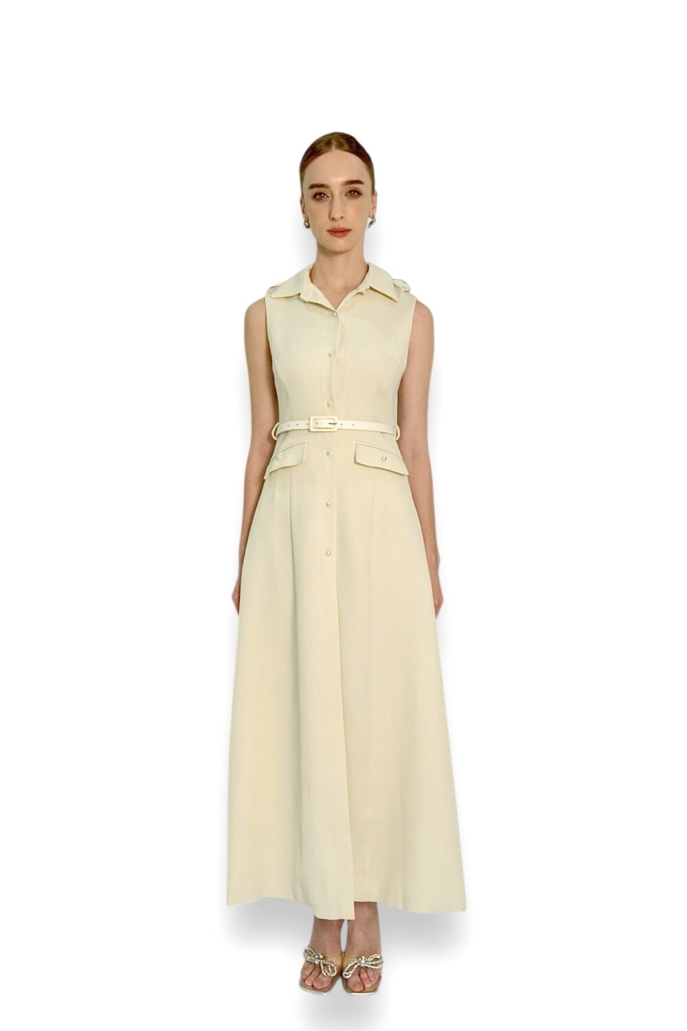 A sleeveless, collared A-line dress featuring a structured button-down front and an adjustable belt at the waist for a tailored silhouette.