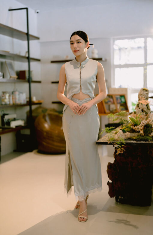 a modern Oriental silhouette wrapped in elegance and quiet romance.